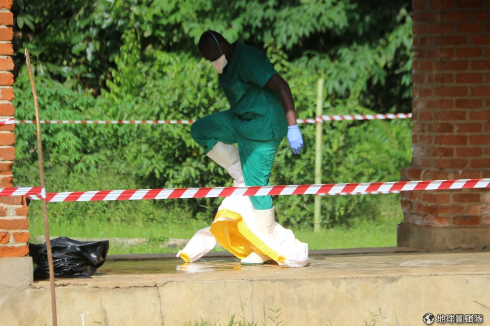 在比科羅(Bikoro)醫院隔離病房外,一名醫護人員正將身上的防護衣脫下,他剛剛進入隔離病房中接觸疑似伊波拉病毒感染的案例。原本在非洲銷聲匿跡的伊波拉病毒,疑似又捲土重來攻擊非洲,引起國際關注。