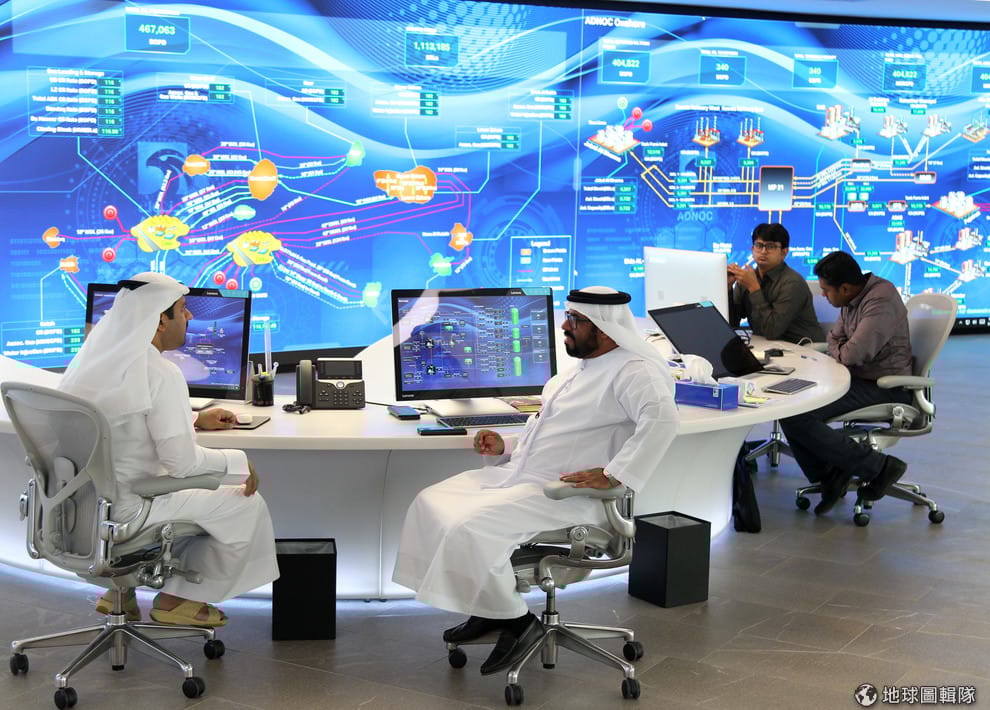 在阿布達比的國家石油公司內,工作人員正在帶有濃濃科技味的「全景數位指揮中心」(Panorama Digital Command Centre)工作。