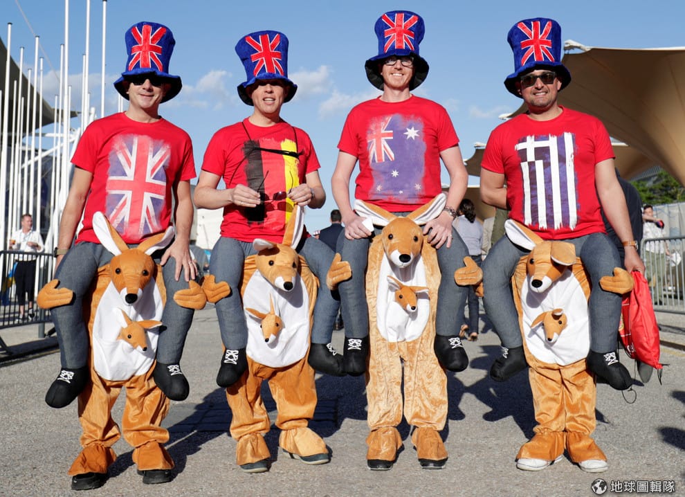 在里斯本阿爾蒂斯競技場(Altice Arena hall)外,來自澳洲的觀眾穿上具有國家特色的服飾,來幫參加歐洲歌唱大賽(Eurovision Song Contest)的澳洲歌手加油。