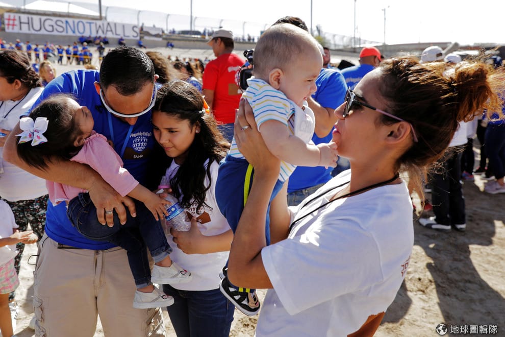 在緊鄰墨西哥華瑞茲城(Ciudad Juárez)的德州艾爾帕索市(El Paso),移民家庭互相擁抱好不容易跨越圍牆來到另一頭的家人。