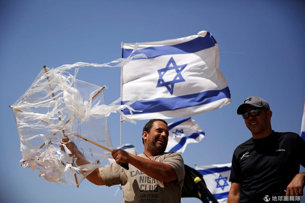 在加薩走廊以色列這一邊,一名以色列男子手上拿著一面風箏,這面風箏剛剛飛在加薩走廊的上空。
