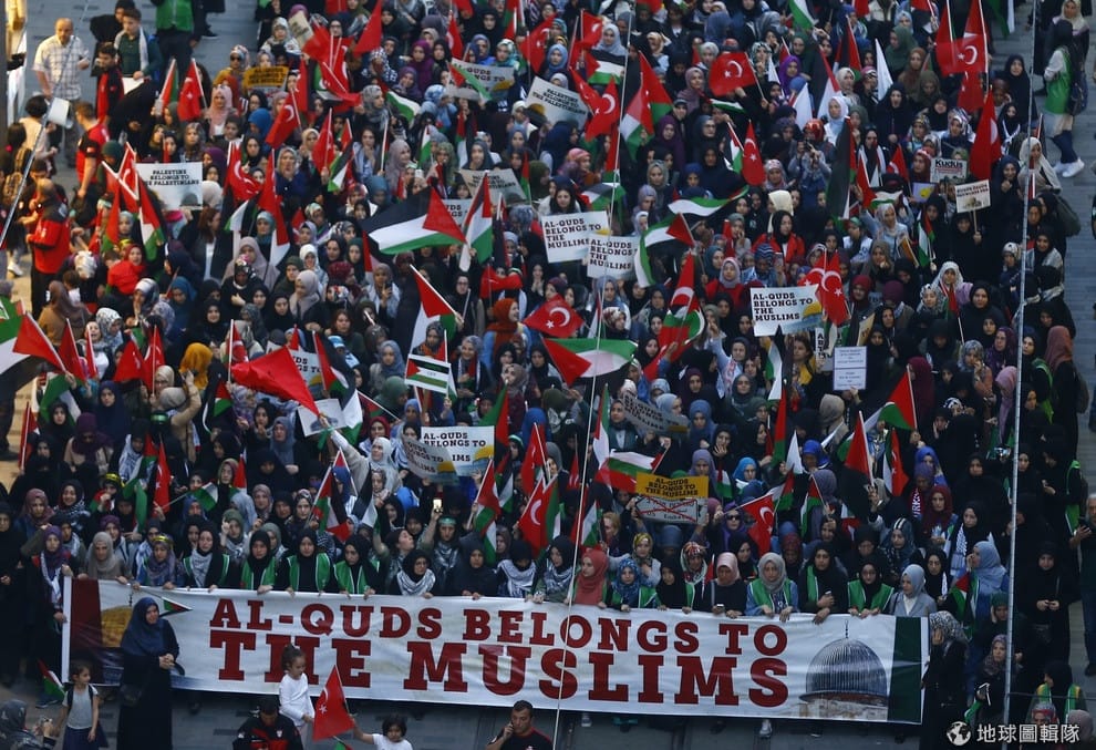 在土耳其伊斯坦堡,成千上萬名民眾上街聲援巴勒斯坦,他們一邊高舉巴勒斯坦國旗,一邊拉起寫有「耶路撒冷屬於穆斯林」字樣的旗幟遊行。