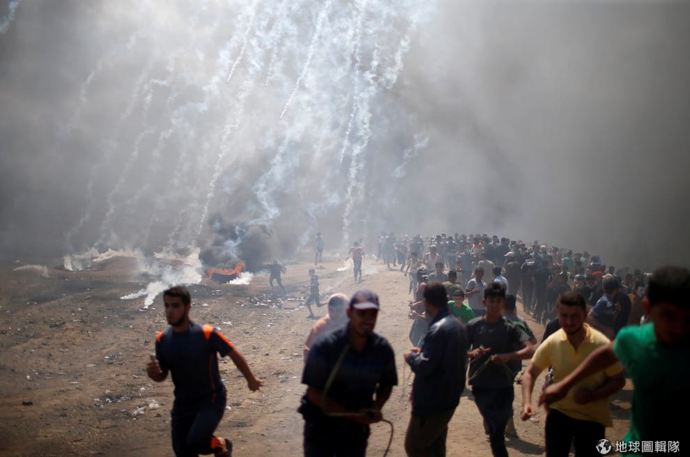 路透社以色列軍隊朝巴勒斯坦抗議民眾發射催淚瓦斯,催淚瓦斯像雨般從天空落在他們的身上。