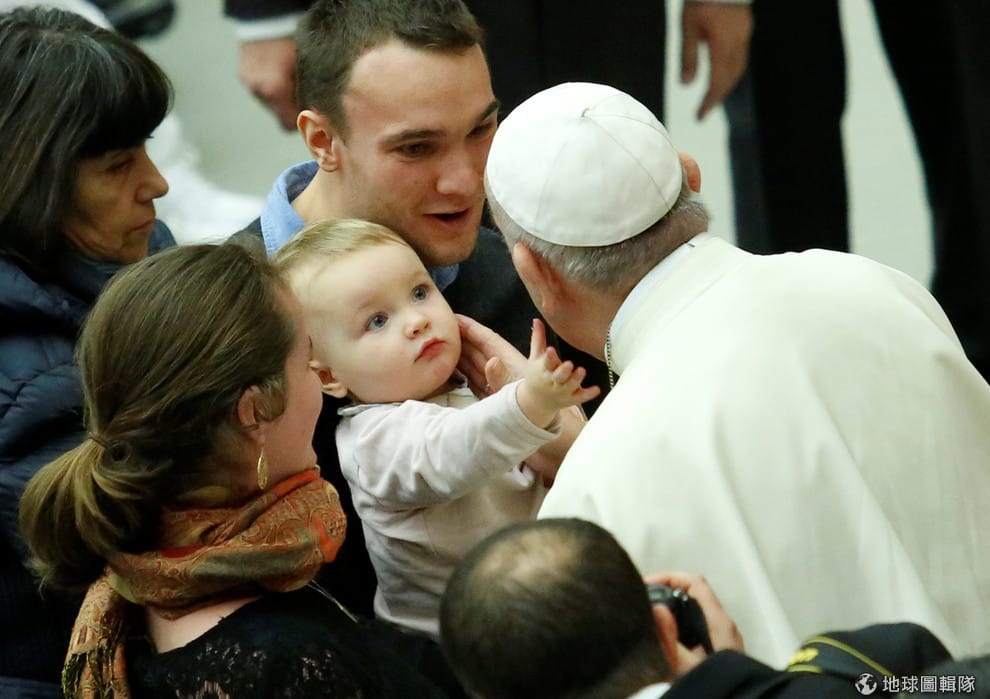今年 1月初,在保祿六世大廳(Paul VI hall)內,羅馬天主教宗方濟各(Pope Francis)正在接見信眾,一名小嬰兒好奇地朝教宗的臉頰摸過去。