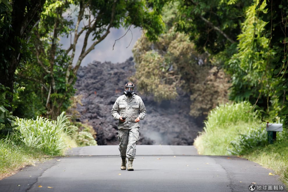 夏威夷國民衛隊中校安東尼(Charles Anthony)戴著防毒面具,手上拿著二氧化硫檢測器,在 137號高速公路上檢測奇勞亞火山(Kilauea volcano)噴發的熔岩毒性。