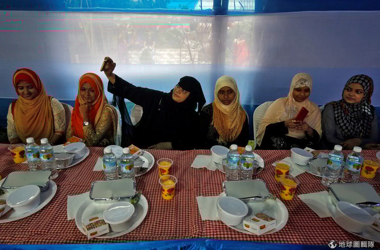 時值「齋戒月」(Ramadan),恪守清晨到傍晚不進食也不喝水的穆斯林婦女,坐在一塊等待太陽下山後的第一餐。席間,一名婦女舉起手機自拍。