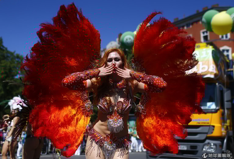 在柏林文化嘉年華上,一名森巴女郎對著鏡頭送飛吻,慶祝柏林的種族多元、文化包容性大。