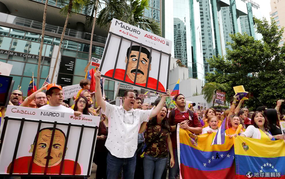 在佛州邁阿密的委內瑞拉大使館外,示威民眾拿著委內瑞拉國旗、高舉現任總統馬杜洛(Nicolas Maduro)被關到監獄裡的海報,抗議正在進行的委內瑞拉總統大選。