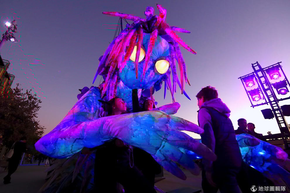 在一年一度的雪梨燈光祭上,一尊 6公尺高的玩偶發出炫目的光芒,和現場的民眾互動。