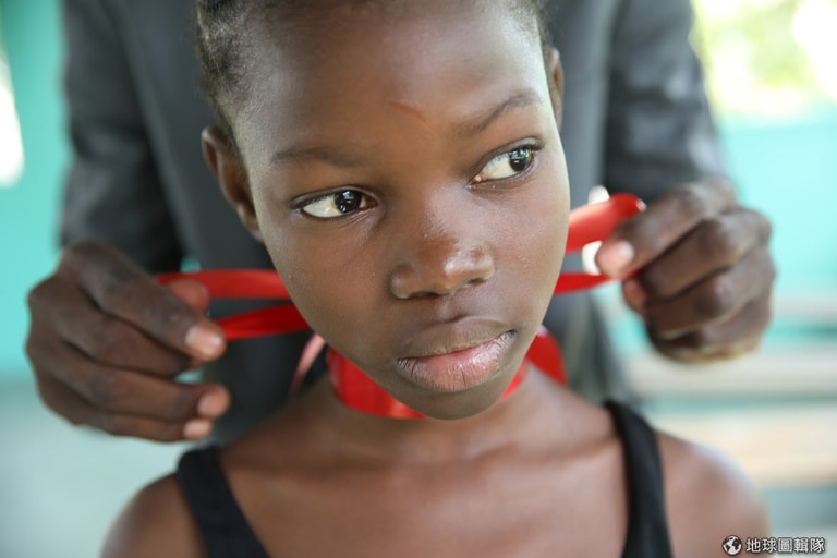 在首都太子港的貧民區太陽城,一名女孩在脖子上綁上紅色蝴蝶結,準備待會上台為前來參訪的西班牙王后萊蒂西亞(Letizia)表演。根據海地的歷史,當地在 1502年正式成為西班牙的殖民地,隨後又輾轉被法國統治,直到 1804年正式脫離法國,成為西半球第一個黑奴成功推翻殖民者,並且以黑人為多數的共和國。