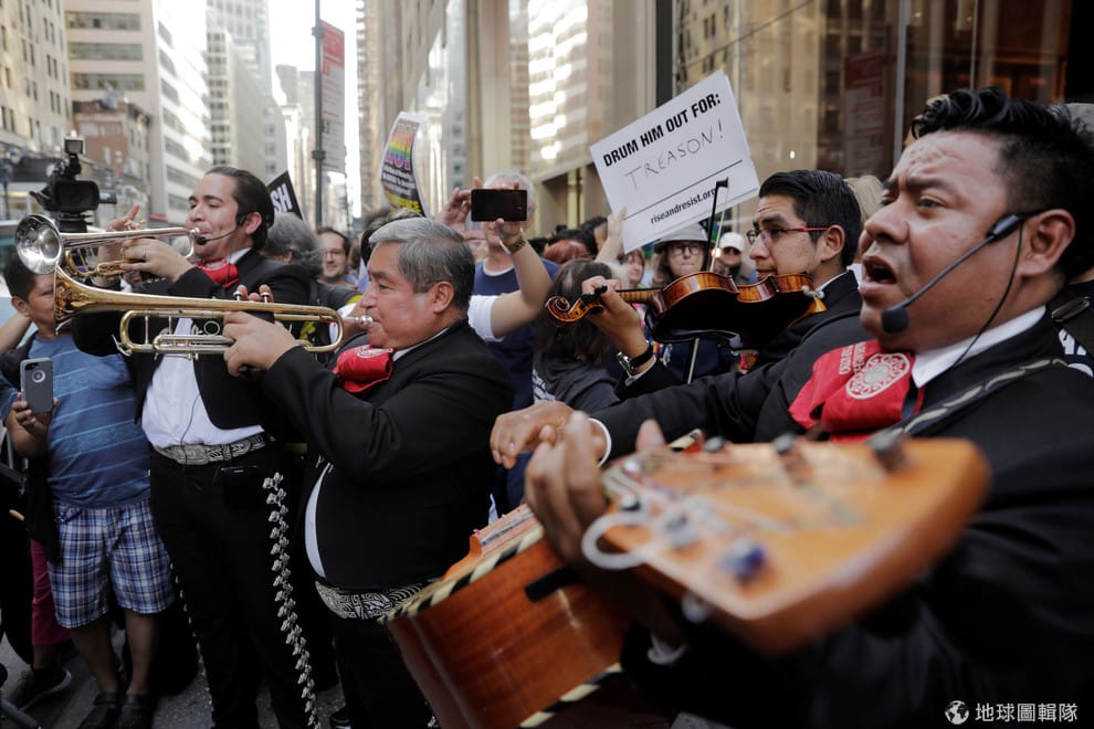 在美國總統川普(Donald Trump)進行募款餐會的樂天紐約皇宮酒店外,墨西哥街頭樂隊(mariachi band)用熱鬧滾滾的音樂抗議川普的移民政策,他們想用充滿拉丁風情的音樂將川普趕出城。