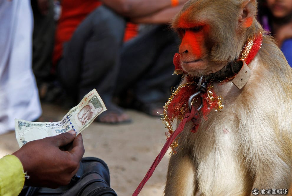 一隻表演猴子低頭看著男子手上的 500盧比。在印度政府的推動下,印度正在創造一個對新創公司更為友善的環境。