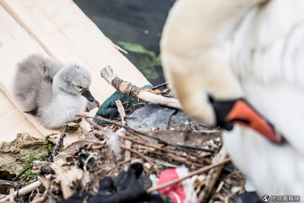 在首都哥本哈根(Copenhagen)靠近露易絲女王橋(Queen Louise bridge)的湖畔邊,天鵝媽媽和牠的孩子在部分由垃圾打造的巢裡休息著。