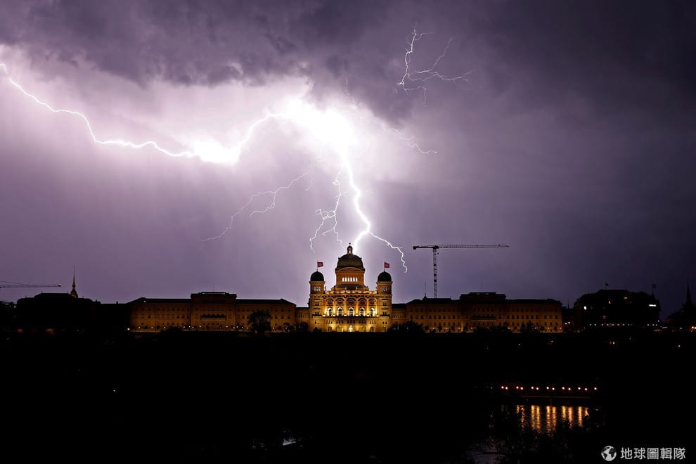 在瑞士首都伯恩(Bern),一道大大的閃電正好劈在聯邦宮(Swiss Federal Palace, Bundeshaus)上頭。