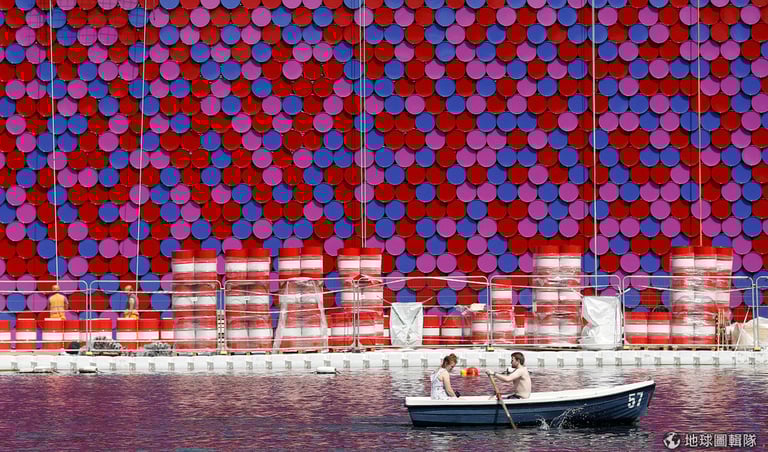 人們划船經過了以塑膠桶建置的藝術品「埃及墓室」(The Mastaba),這是由環境藝術家夫婦克里斯多(Christo Jarachef)、珍-克勞德(Jeanne-Claude)共同設計,珍-克勞德已經在 2009年逝世。