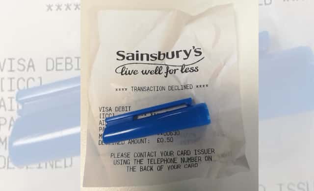 超市森寶利(Sainsbury’s)的收據上顯示了使用VISA卡交易失敗的訊息,上面的字樣寫著:「交易遭拒。VISA信用卡......請透過卡片背後的電話號碼,與你的卡片發行單位聯繫。」