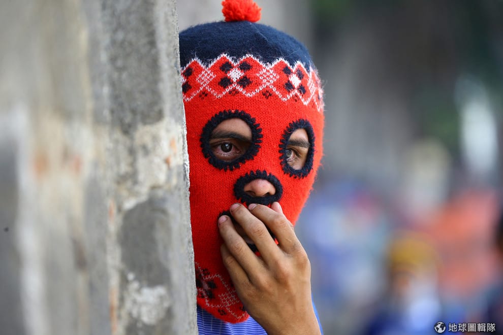 一名示威者在與鎮暴警察發生衝突後,探出頭來觀察現在的情勢。這些人上街是為了對總統奧蒂嘉(Daniel Ortega)所領導的政府表達不滿。