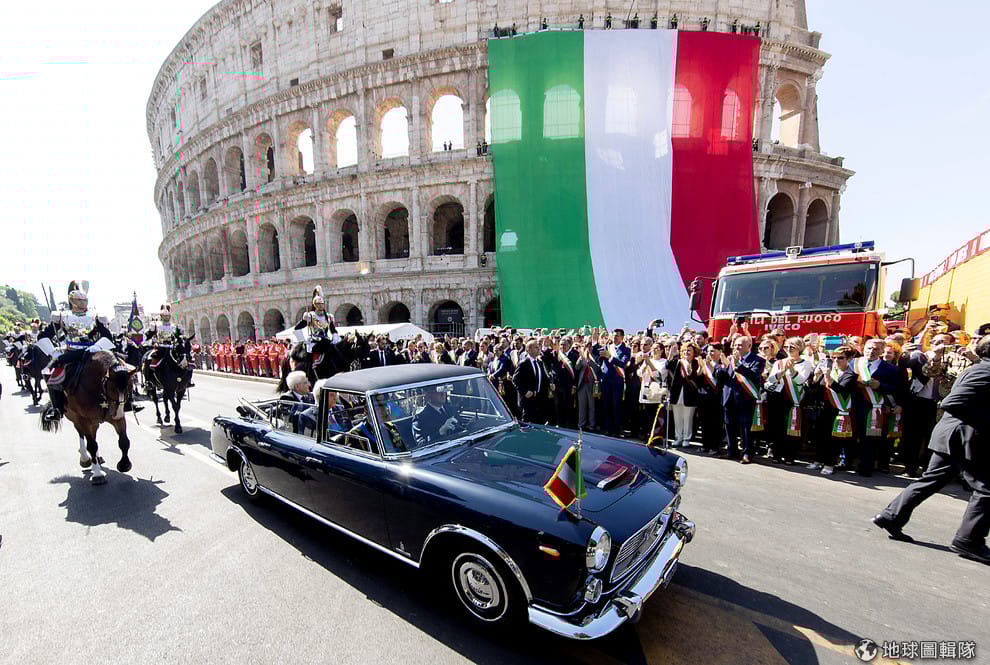 時值義大利共和日的軍隊遊行上,義大利總統馬達雷拉(Sergio Mattarella)的車隊行經了義大利著名景點羅馬競技場。