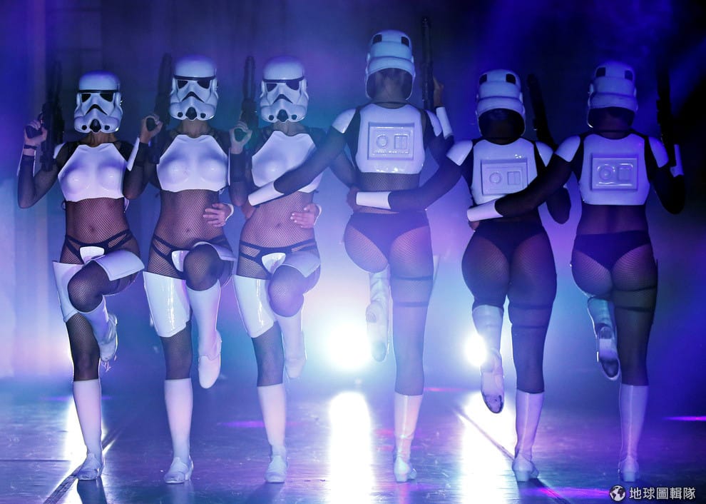 在加州洛杉磯,表演者打扮成帝國風暴兵(Stormtrooper)的模樣,進行著「帝國大反擊:星際大戰滑稽模仿秀」的舞蹈表演。