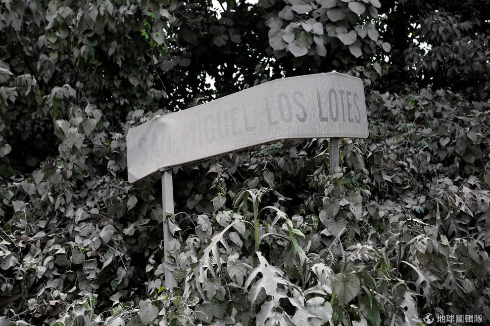 在位於瓜地馬拉南部的火峰火山(Fuego)爆發後,鄰近的路標、植物都覆蓋上了一層厚厚的火山灰,讓過往充滿生機的模樣不復見。