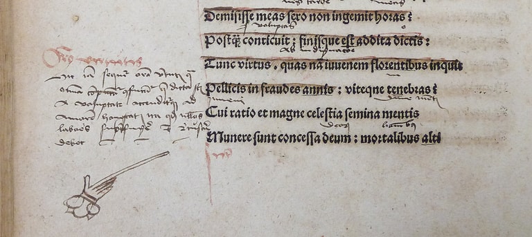 舉例來說,14世紀手指符號的使用達到高峰,人文學者非常喜歡在書籍的邊緣畫上這樣的符號,並且配上自己的註解。其中,最簡單的手指符號莫過於伸出食指的手勢。而14世紀義大利人文學者、被譽為人文主義之父的佩脫拉克(Francesco Petrarca)所繪的手指符號很有特色:大拇指會清楚地畫出來,再搭配上「五」根手指頭。