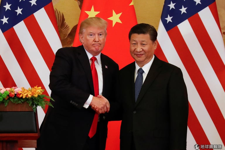 2017年11月9日,川普出訪中國,他在北京人民大會堂召開的美中記者會上與中國領導人習近平握手。