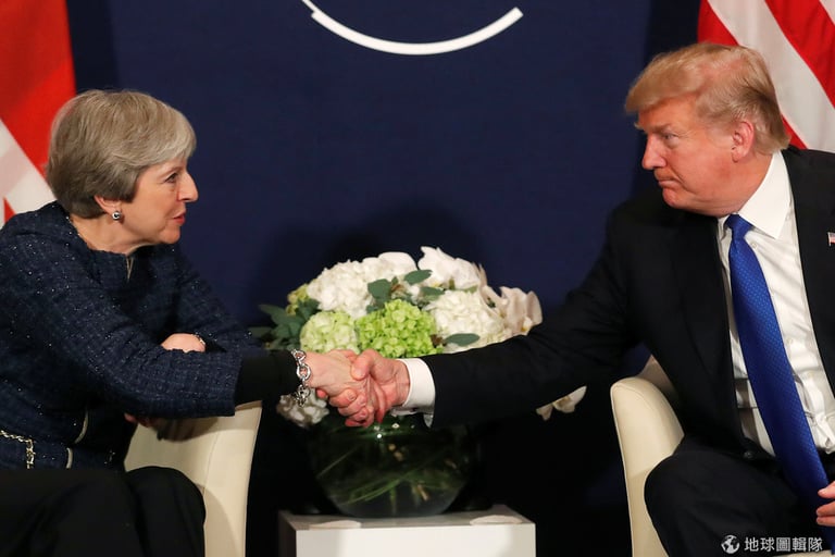 2018年1月25日,在瑞士達佛斯(Davos)世界經濟論壇(World Economic Forum)上,川普和英國首相梅伊(Theresa May)握手。
