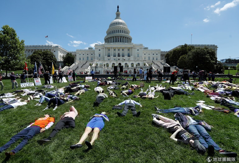 在華盛頓國會山莊前,民眾躺在大草坪上裝死抗議,悼念兩年前在佛羅里達州奧蘭多(Orlando)同志夜店Pulse槍案中罹難的 49名受害者。