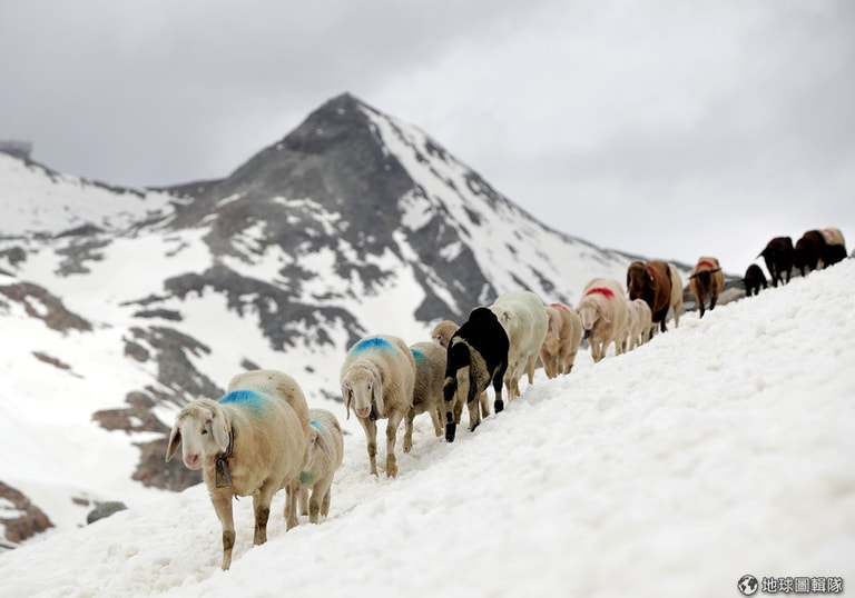 12號這天,一群被作上記號的綿羊走在Hochjochferner冰川前。
