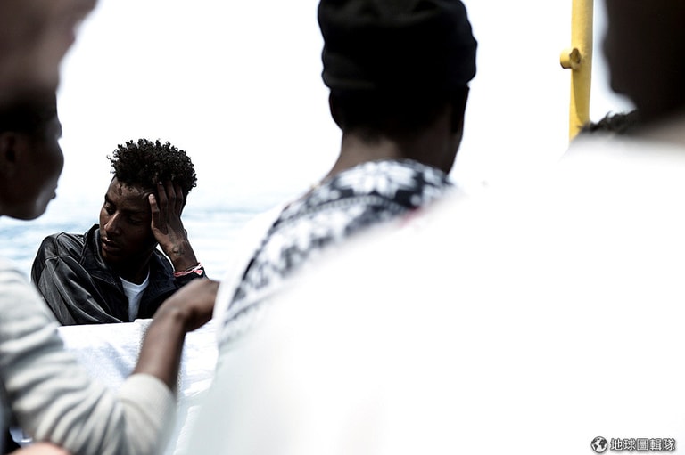在非政府地中海救援組織(SOS Mediterranee)的救援船「寶瓶座號」(Aquarius)上,被救起的移民待在甲板上等待上岸通知。