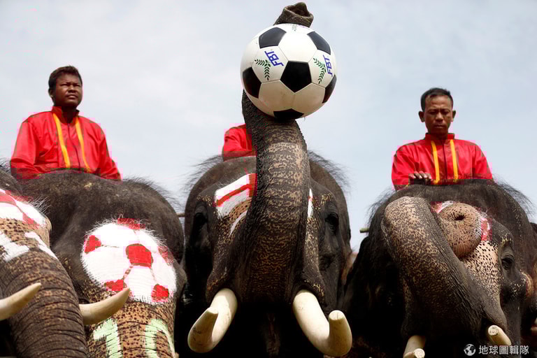 在大城(Ayutthaya)的一場反賭博校園宣導活動中,象伕帶著大象在學生面前踢足球,一隻大象用象鼻高高地盤起足球。