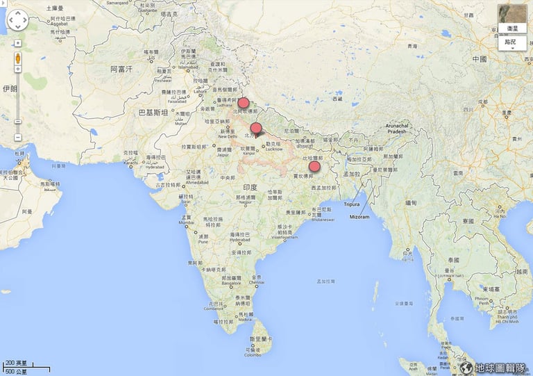 照片中的橘紅標示點就是尼泊爾調查的地區,包含Bihar,Uttar Pradesh,Uttarakhand等地,以及尼泊爾南部。