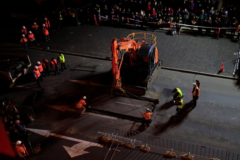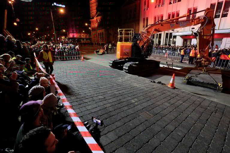 周日(17)晚上,在澳洲塔斯馬尼亞州(Tasmania)荷巴特(Hobart)市中心的麥格理街(Macquarie Street)上,超過 1,000名的民眾冒著嚴寒盯著地上看──工作人員花了 2個小時在柏油路面上挖開一個洞,並在洞裡放入一把梯子之後,73歲的帕爾(Mike Parr)從地底爬了出來。