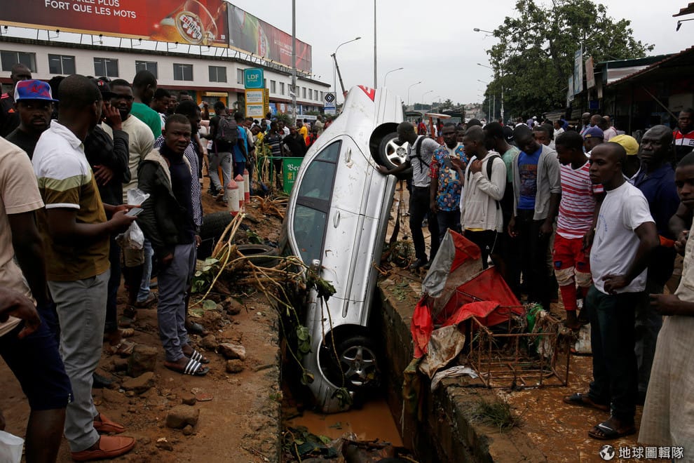 在西非國家象牙海岸最大都市阿必尚(Abidjan),人們看著卡在水溝動彈不得的車子,這輛車子在水災中被從大街上沖到水溝中,足見大水的威力。