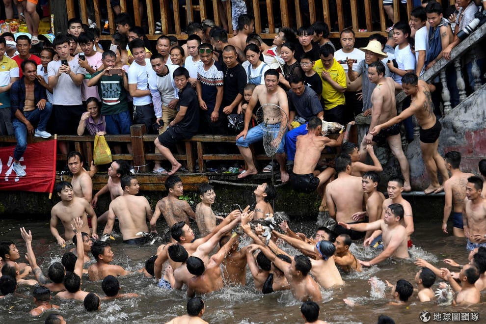 在湖南省沱江鎮,歡慶端午節的民眾按照過去的傳統,跳下水抓鴨子象徵「搶鳳凰」取個好彩頭之意。