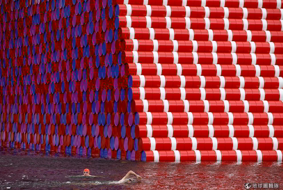 首圖故事:泳客們游過堆疊成「埃及墓室」形狀的水桶......