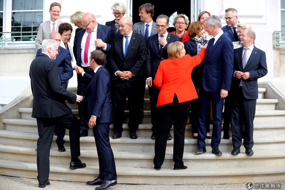 在德法部長理事會召開前,德國總理梅克爾(Angela Merkel,紅衣者)和法國總統馬克宏(Emmanuel Macron,前排左二)忙著幫大家整理衣服和打招呼,準備先來張大合照。