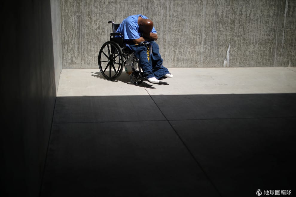 在加州醫療保健機構內,一名坐在輪椅上的受刑人待在牢房的院子裡,這個機構專門收容罹患失智症、阿茲海默症與認知衰退疾病的受刑人。