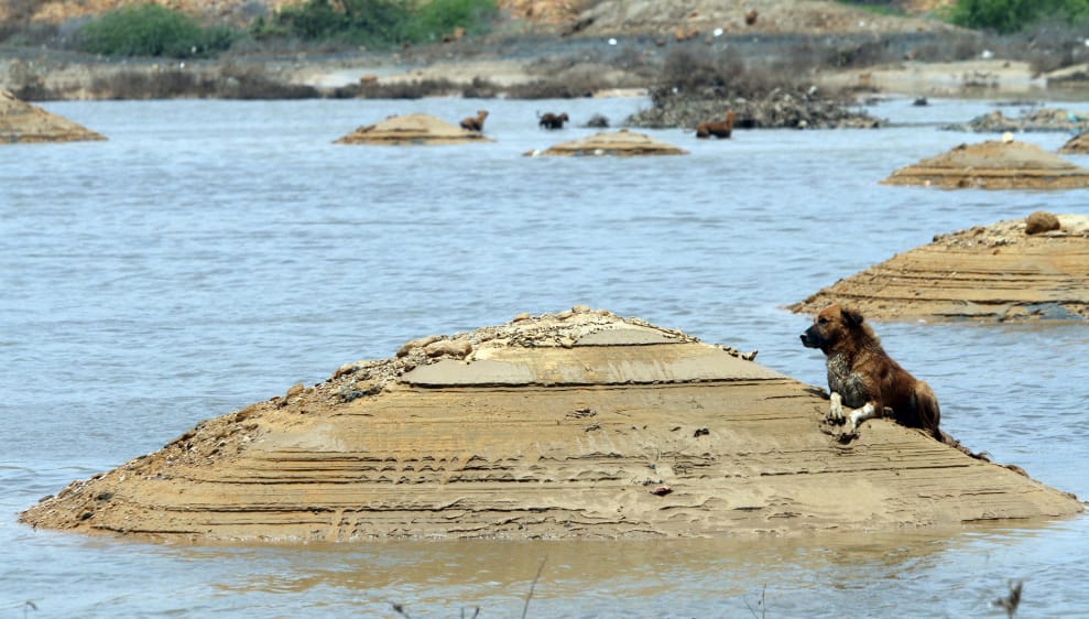 2013年4月,在一個因為大雨導致水位暴漲的區域,好幾隻狗狗趴臥在沒被雨水吞噬的地方等著水位褪去。