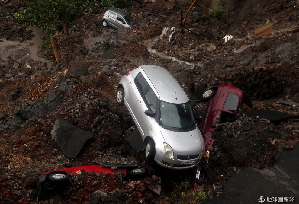 在孟買(Mumbai),一棟民宅的牆壁因為暴雨倒塌,連帶波及到無數台停在一旁的車輛。