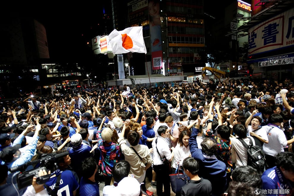 面對日本隊對上塞內加爾隊的世足小組賽,在澀谷街頭,日本球迷正在替他們的球員加油打氣。最後這場比賽以 2:2畫下句點。