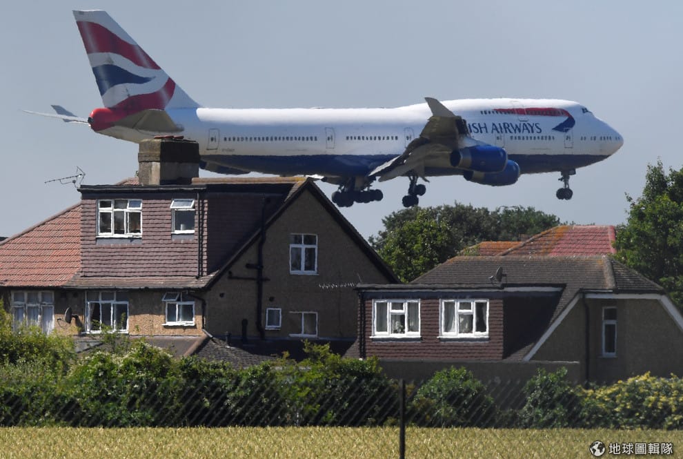 在倫敦希斯洛機場附近,一架波音747正準備降落,龐大的機身與屋子成了鮮明對比。