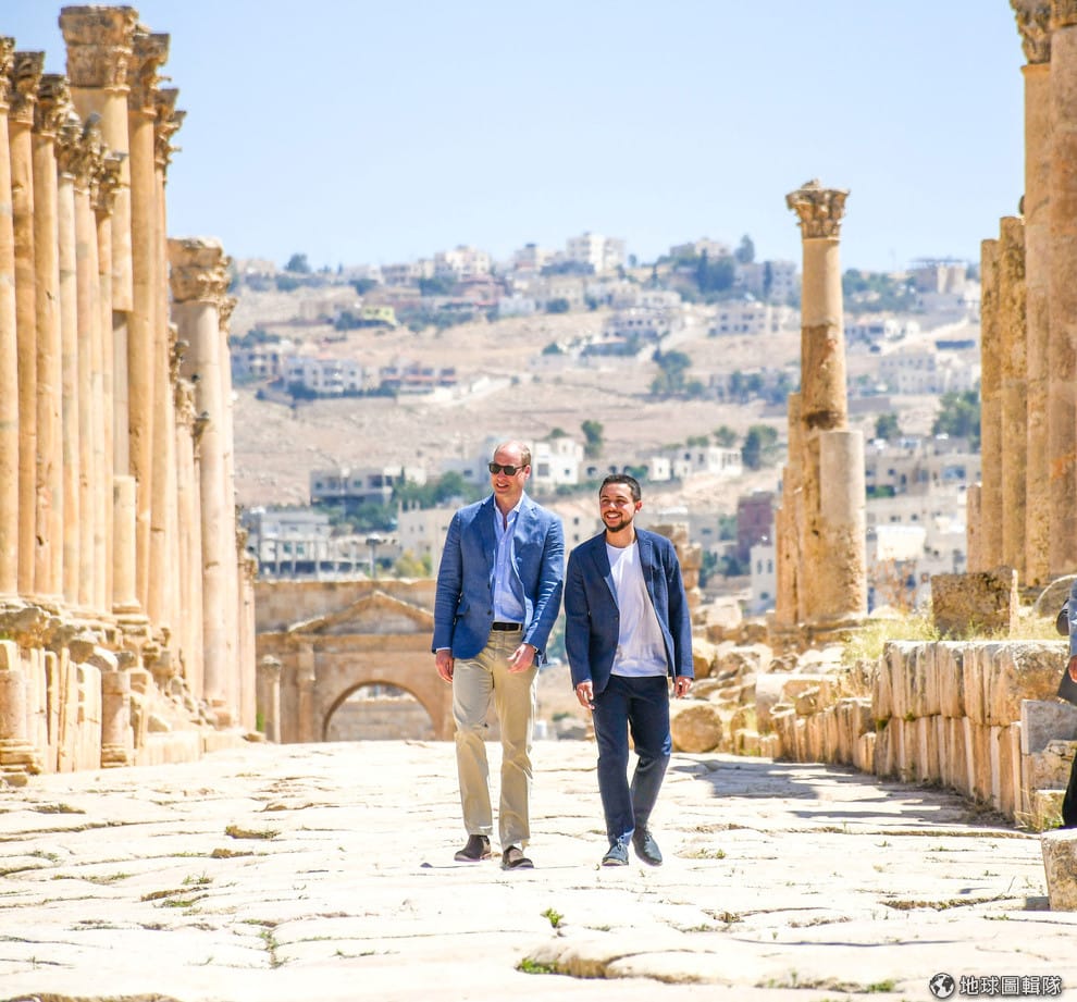 在傑拉什(Jerash)的古城區,約旦王儲侯賽因.阿布杜拉(Hussein bin Abdullah)正在接待來訪的英國威廉王子(Prince William)。英國威廉王子在這幾天展開中東巡訪,並計畫在約旦停留兩天。