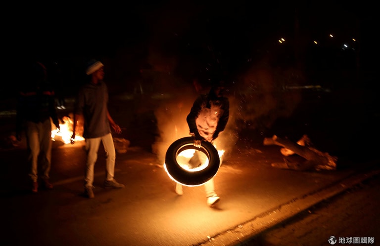 在城市索韋托(Soweto)東部區域,一名男子準備用燃燒的輪胎製作路障,抗議在當地發生的停電事件。