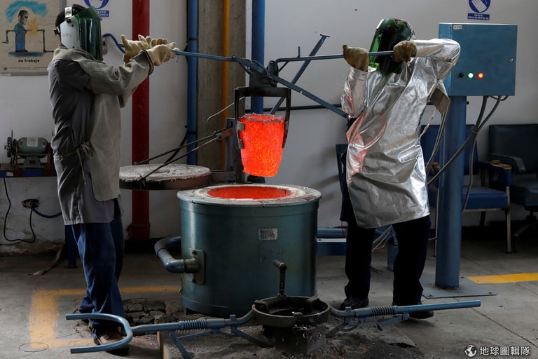 在首都卡拉卡斯(Caracas),工人們小心地抬起加熱熔化的鋁,準備將之澆鑄進鑄模成型。