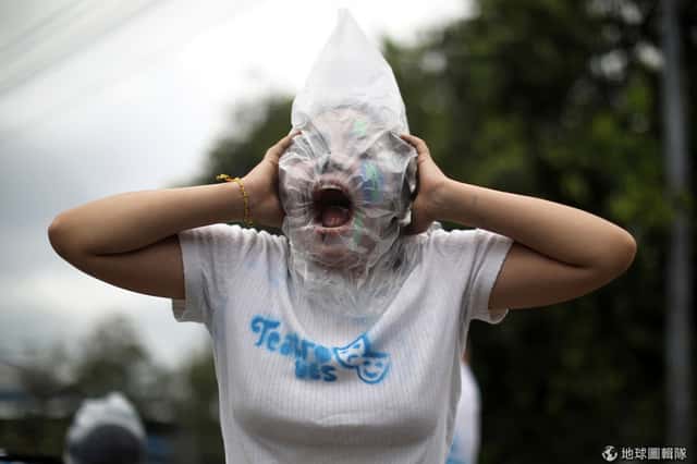 在薩爾瓦多首都聖薩爾瓦多(San Salvador),一名示威者把塑膠袋套在頭上,抗議政府打算將自來水私營化的政策。