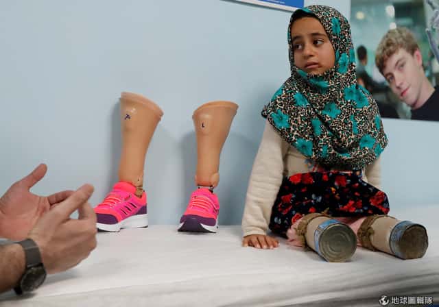 在伊斯坦堡(Istanbul)的義肢中心,今年 8歲的敘利亞女孩梅利(Maya Meri)正在等待安裝義肢,取代她先前用來充當雙腳的鐵罐。