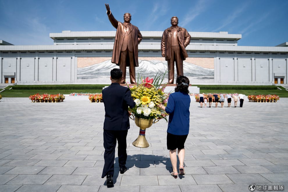在首都平壤的已故前領導人金日成(左)與金正日(右)大型銅像前,民眾抬著鮮花準備獻給他們。