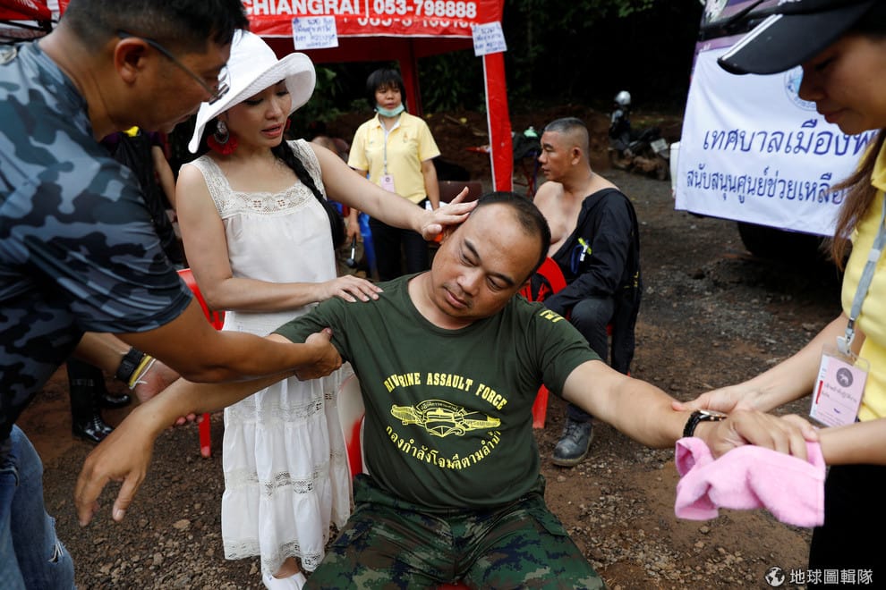 在清萊府美塞縣鐘乳石洞Tham Luang前,民眾七手八腳地幫搜救隊員按摩,待會這名搜救隊員即將重返洞穴,將受困的足球隊教練和少年救出來。