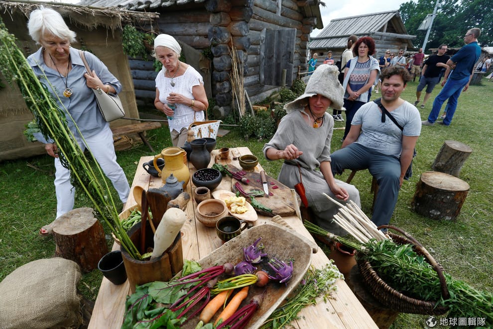 在熱門考古遺址克爾韋納(Kernave),遊客好奇地參觀還原中古世紀的做菜場景,這是國際實驗考古節的展覽之一。